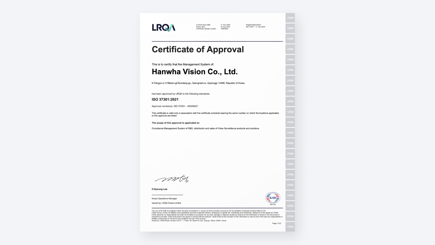 Supported by this structured system and transparent communication, Hanwha Vision became the first company in Korea's video surveillance industry to obtain ISO 37301 certification in July 2024, recognizing the strength of our compliance management.